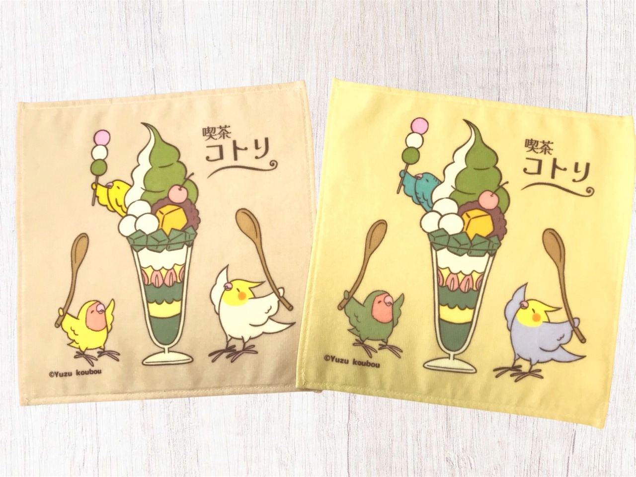 抹茶パフェに大喜び!な小鳥たちのハンカチタオル。柔らかな肌触りの綿100%です。