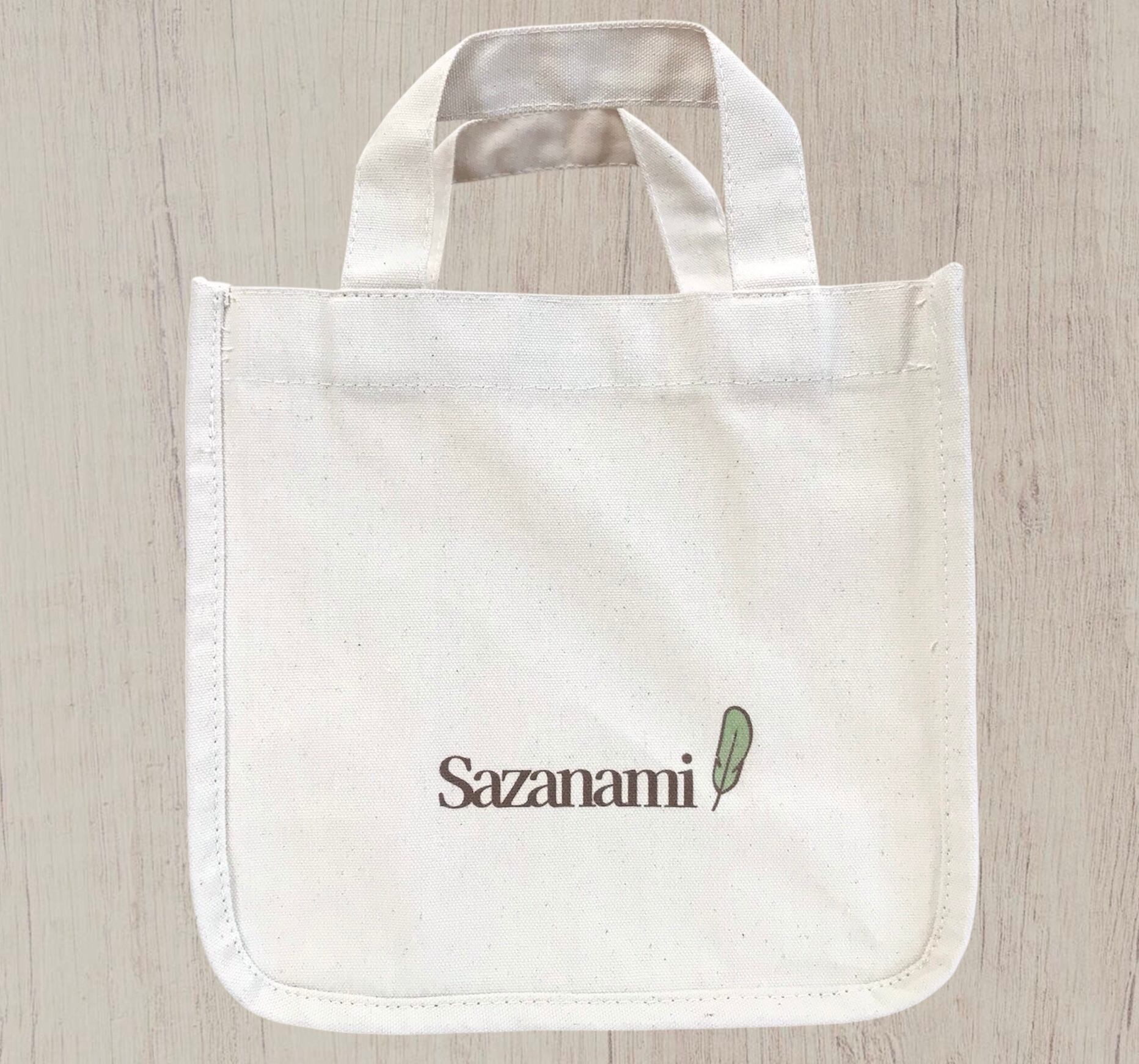 たっぷり12㎝のマチがあるので、ランチトートとしても、ちょっとしたお出かけにも使いやすいサイズです。裏面にはサザナミロゴ入り♪
