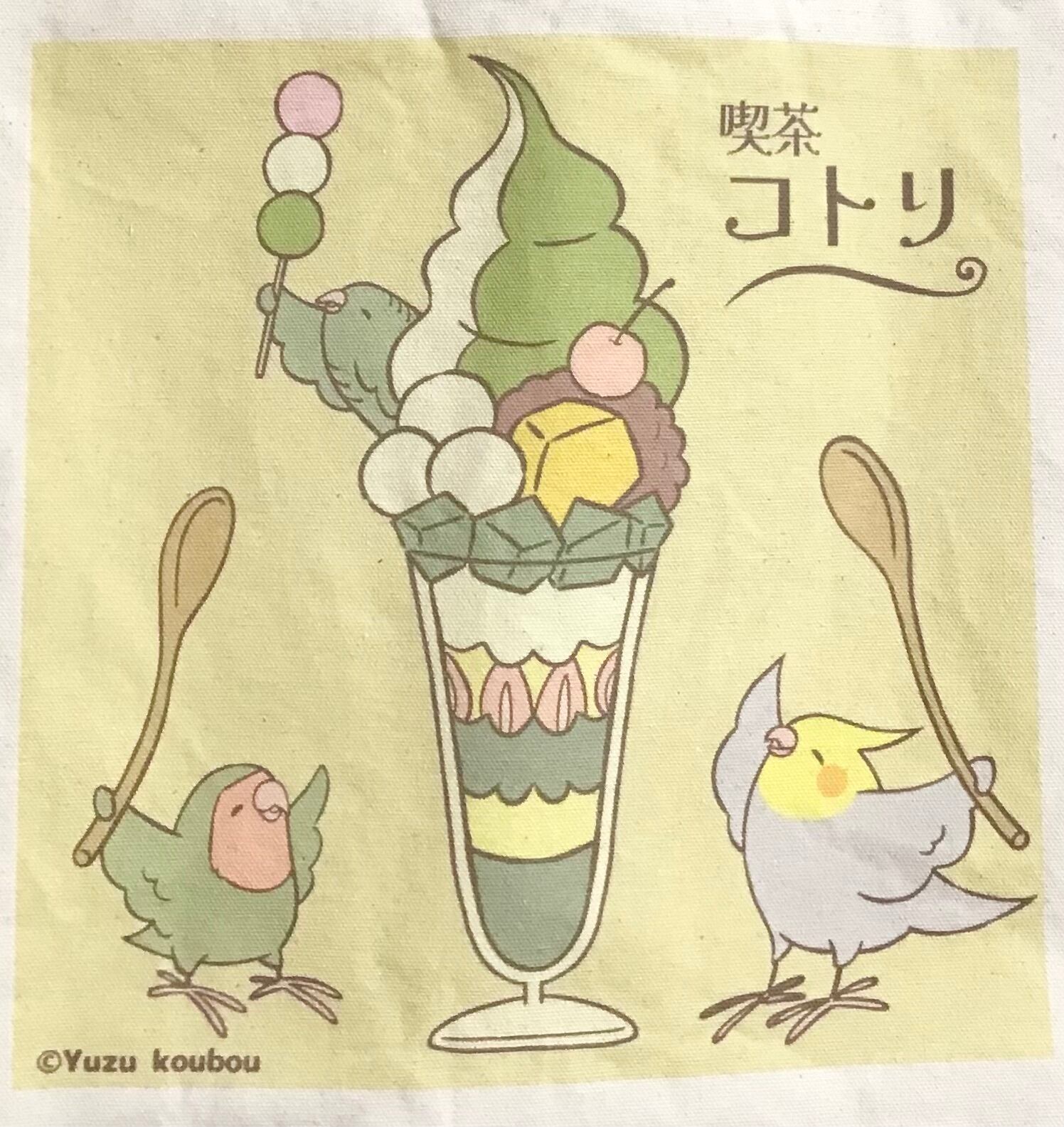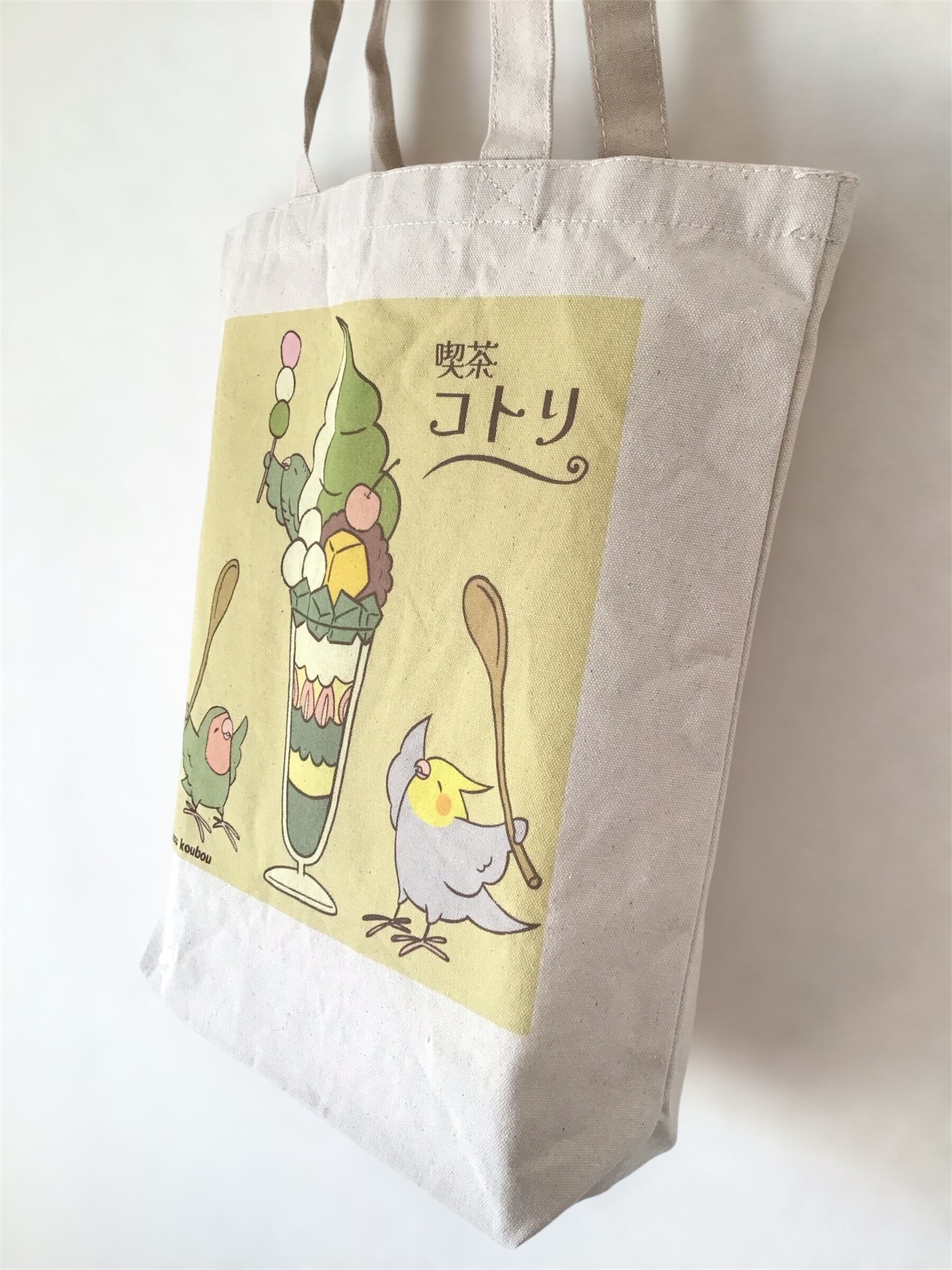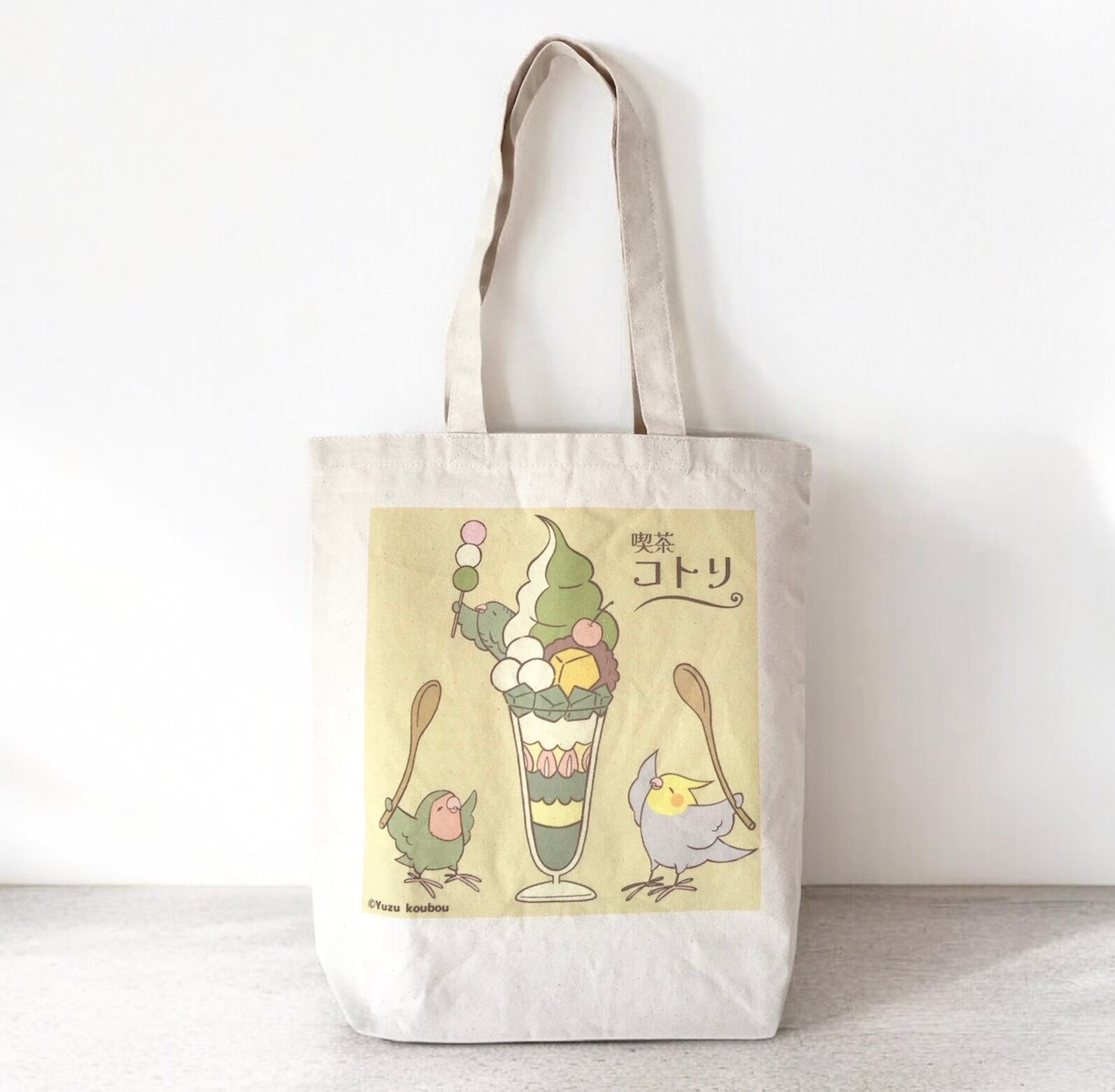 オカメインコ・コザクラインコ・サザナミインコのノーマルちゃんが抹茶パフェに大喜び!なイラストのトートバッグ。