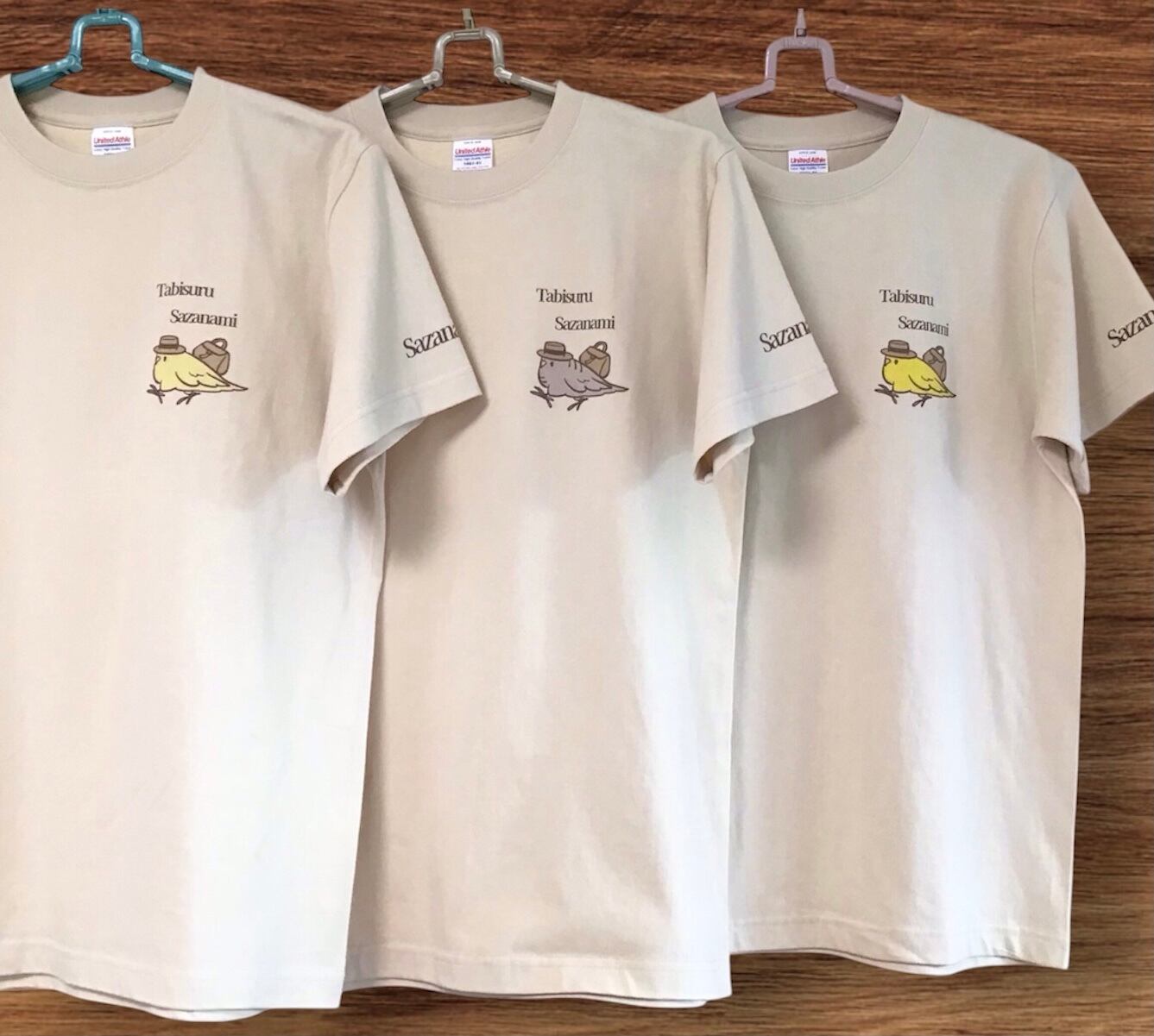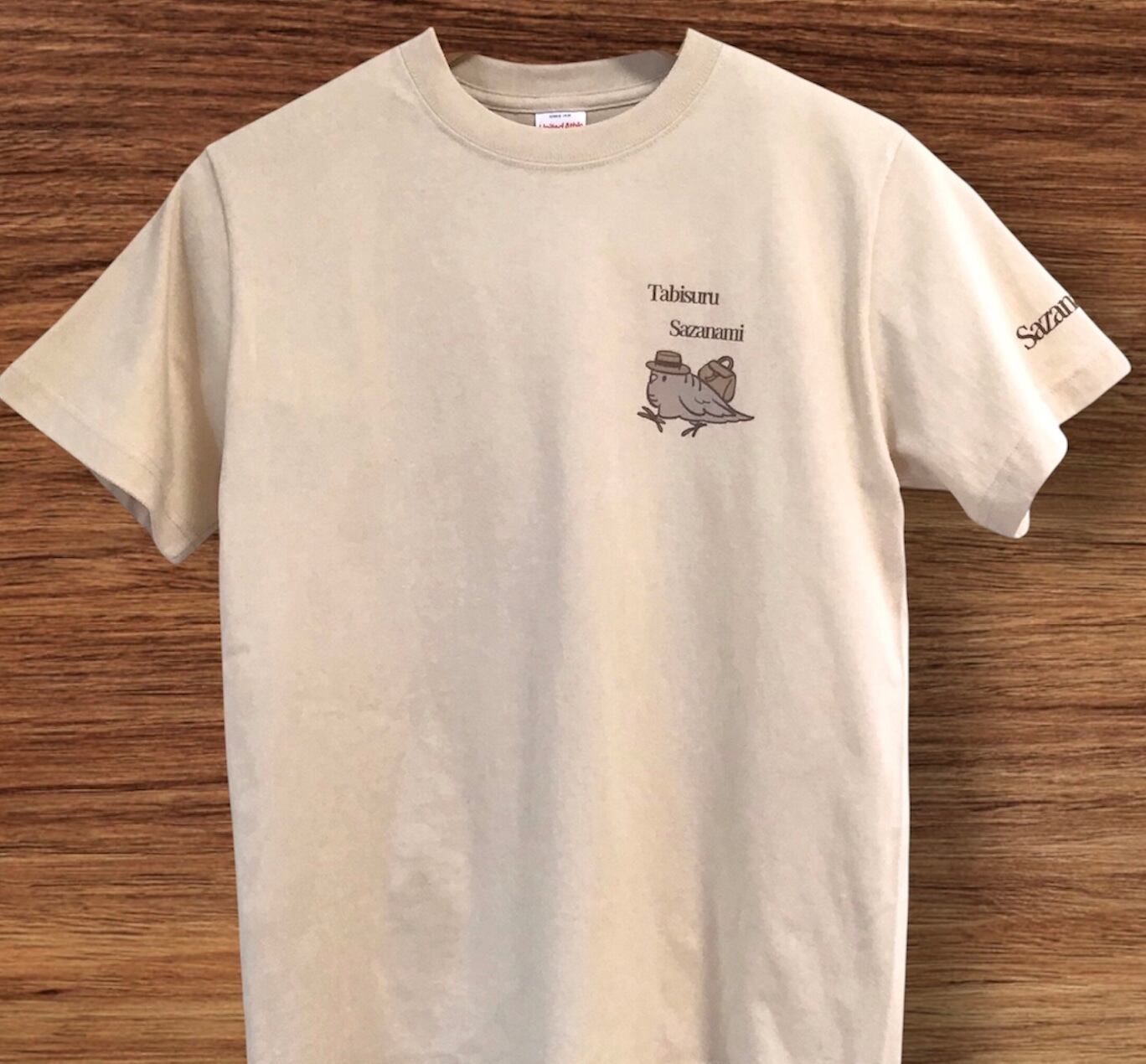 古い外国の絵本のような、どこかノスタルジック感漂うサザナミさんをイメージしました。ワンポイントTシャツかと思いきや、こっそり左袖にもサザナミロゴ入り!